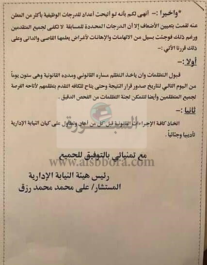 أصدر المستشار على محمد محمد رزق، رئيس هيئة النيابة الادارية، اليوم الثلاثاء، بياناّ أكد فيه على قبول التظلمات وان ياخذ التظلم مساره القانونى ومدده القانونية، وهى ستون يوما من اليوم التالى لتاريخ صدور قرار النتيجة وحتى يتاح للكافة التقدم بتظلم لإتاحة الفرص لجميع المتظلمين وأيضا لتمكين لجنة التظلمات من الفحص الدقيق، وشدد رزق على إاتخاذ كافة الأجراءات القانونية ضد من أهان وتطاول على كيان النيابة الإدارية تاديبا وجنائيا.