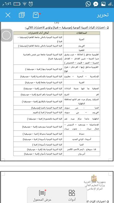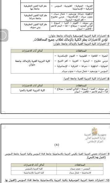 المحافظاتأماكن أداء الاختباراتالجيزةكلية التربية النوعية بالدقى جامعة القاهرة (موسيقية – فنية )الفيـوم كلية التربية النوعية بالدقى جامعة القاهرة (موسيقية )القاهرة كلية التربية النوعية جامعة عين شمس بالعباسية (موسيقية -فنية)القليوبية مناطق ( الخانكة – غرب وشرق شبرا الخيمة– شبين القناطر – القناطر الخيرية – العبور – قليوب – الخصوص )القليوبية مناطق (بنها – كفر شكر – طوخ – قها)كلية التربية النوعية ببنها ( فنية – موسيقية )الإسكندرية – البحيرة – مطروحكلية التربية النوعية بالإسكندرية (فنية – موسيقية)الغربيةكلية التربية النوعية بطنطا (فنية – موسيقية)المنوفية بما فيها مدينة الساداتكلية التربية النوعية بأشمون (فنية – موسيقية)كفر الشيخ كلية التربية النوعية بكفر الشيخ (فنية – موسيقية)الشرقية, ومركز ميت غمر التابع لمحافظة الدقهلية كلية التربية النوعية بالزقازيق (فنية – موسيقية )المنيا - بنى سويف كلية التربية النوعية بالمنيا (موسيقية)الفيـوم– بني سويفكلية التربية النوعية ( فنية ) بالفيوم الدقهلية ماعدا مركز ميت غمركلية التربية بالمنصورة ( فنية – موسيقية )الإسماعيلية – بورسعيد – السويس – شمال سيناء - جنوب سيناء كلية التربية النوعية ببورسعيد (فنية – موسيقية)دمياط كلية التربية النوعية بدمياط ( فنية – موسيقية )أسيوط - الوادي الجديد كلية التربية النوعية بأسيوط ( فنية – موسيقية)المنياكلية التربية النوعية بأسيوط ( فنية )قنا - سوهاج - البحر الأحمر- الأقصر كلية التربية النوعية بقنا (فنية – موسيقية)أســوان كلية التربية النوعية بأسوان (فنية – موسيقية)