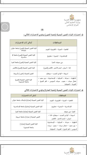 المحافظات أماكن أداء الاختباراتالقاهرة – الجيزة – القليوبية- الفيوم كلية الفنون الجميلة (فنون) جامعة حلوان بالزمالك الإسكندرية – البحيرة – مطروحكلية الفنون الجميلة (فنون) جامعة الإسكندرية بني سويف- المنيا كلية الفنون الجميلة (فنون) جامعة المنيا قنا – أسوان- البحر الأحمر - الأقصر (فنون)كلية الفنون الجميلة (فنون) بالأقصر اسيوط – الوادى الجديد – سوهاج الفنون الجميلة ( فنون ) بأسيوطالدقهلية – دمياط – الشرقية – الإسماعيلية – بور سعيد – شمال سيناء – جنوب سيناء- السويس – كفر الشيخ – الغربية – المنوفية.كلية الفنون الجميلة (فنون)