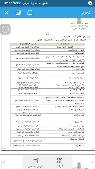 المحافظاتأماكن أداء الاختبارات القاهرة – الجيزة(بنين)كلية التربية الرياضية للبنين بالهرم القاهرة – الجيزة(بنات)كلية التربية الرياضية للبنات بالجزيرة القليوبية(بنين) كلية التربية الرياضية للبنين ببنهاالإسكندرية – البحيرة عدا مناطق : كوم حمادة – وادي النطرون – مديرية التحرير(بنين) كلية التربية الرياضية للبنين بأبي قيرالإسكندرية - مطروح – البحيرة عدا مناطق" كوم حمادة– وادي النطرون – مديرية التحرير"(بنات)كلية التربية الرياضية للبنات بفلمنج مطروح (بنين)كلية التربية الرياضية للبنين بمطروح المنيا (بنين – بنات)كلية التربية الرياضية بالمنياأسيوط (بنين – بنات)كلية التربية الرياضية بأسيوط الوادي الجديد(بنين – بنات)كلية التربية الرياضية بالوادي الجديد قنا - البحر الأحمر – الأقصر(بنين – بنات)كلية التربية الرياضية بقناسوهاج (بنين – بنات)كلية التربية الرياضية بسوهاج أسوان (بنين – بنات)كلية التربية الرياضية بأسوان الغربية (بنين - بنات)كلية التربية الرياضية طنطامدينة السادات بالإضافة إلى مناطق : كوم حماده – وادي النطرون – مديرية التحرير- اشمون – منوف - الشهداء (بنين - بنات)كلية التربية الرياضية بمدينة السادات المنوفية ماعدا مدينة السادات (بنين - بنات)كلية التربية الرياضية بشبين الكومالشرقية (بنين - بنات)
