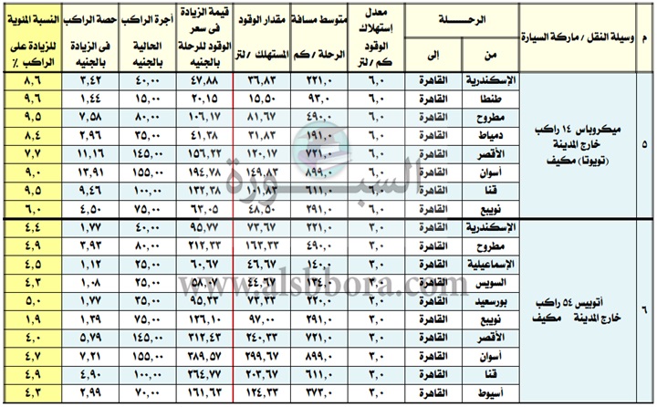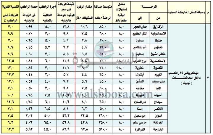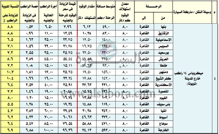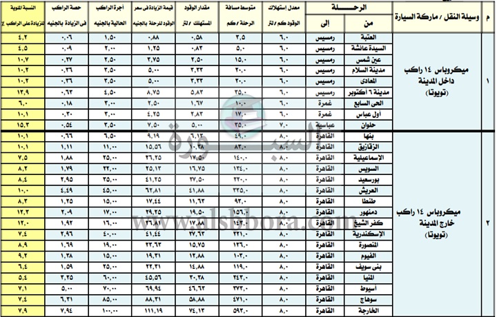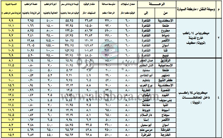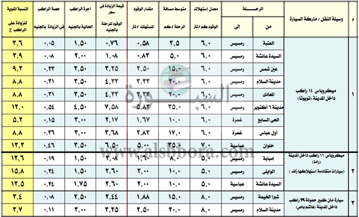 تنشر "السبورة" تعريفة الركوب لسيارات الأجرة والتاكسى ونقل البضائع الجديدة ، فى المحافظات، وفق التقديرات التى وضعها الجهاز المركزى للتعبئة العامة والإحصاء.