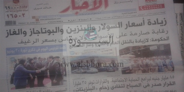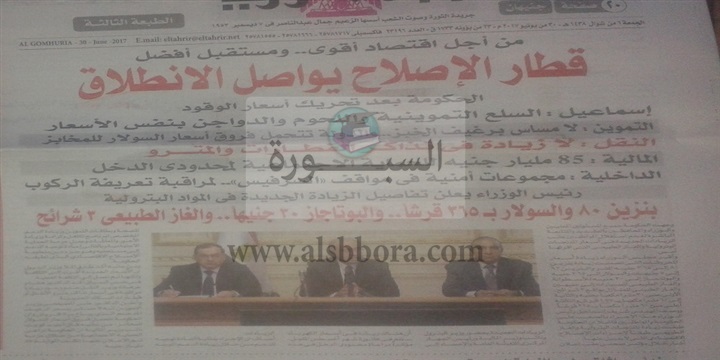 تصدرت زيادة الأسعار عناوين الصحف القومية اليوم الجمعة الموافق 30 يونيو 2017، حيث قالت صحيفة الأخبار أن أنبوبة البوتاجاز قد تم تسعيرها بمبلغ 30 جنيها، بينما جاء بنزين 92 5 جنيهات، و365 قرشا للسولار وبنزين 80، و660 قرشا لـ 95.