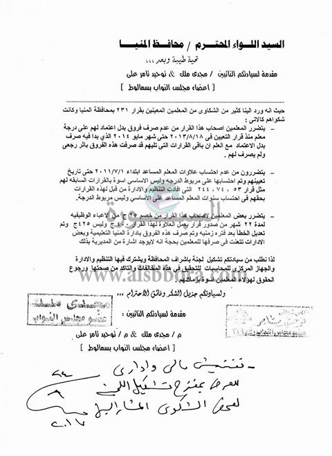 طالب كل من مجدى ملك وتوحيد تامر على عصوا مجلس النواب عن ادارة سمالوط بمحافظة المنيا المحافظ بصرف فروق علاوة الأعباء الوظيفية للمعلمين المعينين بقرار رقم 231.