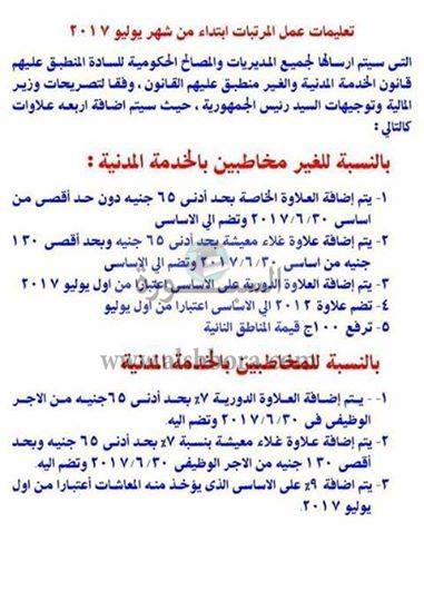 ينشر موقع السبورة تعليمات وزارة المالية بشأن عمل المرتبات ابتداء من شهر يوليو الجارى 2017، والتى سيتم ارسالها لجميع المديريات والمصالح الحكومية للسادة المنطبق عليهم قانون الخدمة المدنية وغير المنطبق عليه القانون وفقا لتصريحات وزير المالية وتوديهات رئيس الجمهورية، حيث سيتم اضافة اربعة علاوات كالتالى: