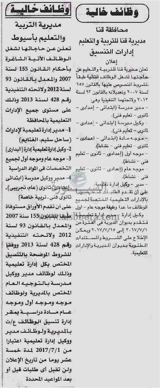 اعلنت وزارة التربية والتعليم 1 يوليو 2017 عن حاجتها لشغل عدد من الوظائف الشاغرة بعدد من المحافظات من خريجي الجامعات المصرية ,وبدء الاعلان اليوم بمديرية التربية والتعليم بمحافظات قنا واسيوط وللتخصصات الواردة فى الاعلان والمنشور بجريدة الاهرام والجمهورية وما يلى تفاصيل الاعلان .