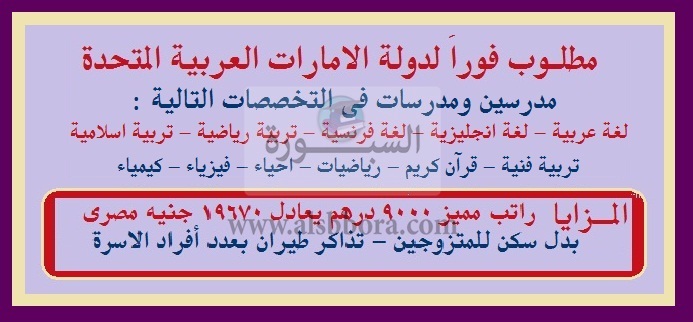 للتعاقد الفورى وبراتب 20 ألف جنيه.. الامارات تعلن عن حاجتها الى معلمين ومعلمات.. ننشر نص الاعلان