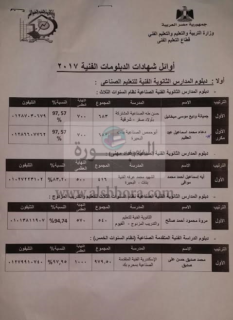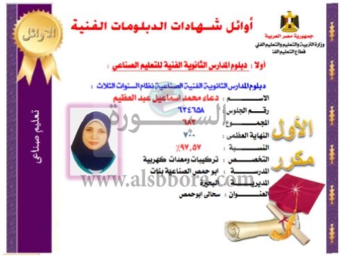 أوضح اللواء المهندس محمد الحلوانى رئيس قطاع التعليم الفنى والمشرف على امتحانات الدبلومات الفنية أن الطالبة دعاء محمد إسماعيل عبد العظيم بمدرسة أبو حمص الصناعية بنات بالبحيرة والحاصلة على مجموع 683 من 700 درجة بترتيب الأول "مكرر" بدبلوم المدارس الثانوية الفنية للتعليم الصناعى نظام (السنوات الثلاث).