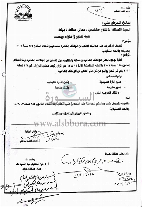 أصدرت مديرية التربية والتعليم بمحافظة دمياط بيانا لها منذ ساعات بشأن وجود عدد من الوظائف الشاغرة للمخاطبين بأحكام القانون 155 لسنة 2007 وتعديلاته ولائحته التنفيذية المادة 11،12من قرار رئيس مجلس الوزراء رقم 428 لسنة 2013 وتشمل الوظائف مدير إدارة تعليمية، مدير مدرسة ،وظائف التوجيه الفني ،وكيل إدارة تعليمية ،وكيل مدرسة.