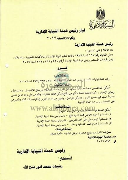 إصدرت المستشارة رشيدة محمد فتح الله، رئيس هيئة النيابة الإدارية، القرار رقم 277 لسنة 2017 والتى يتضمن وقف قرارات رئيس الهيئة السابق رقم 260و261و261لسنة 2017 بشأن المسابقة رقم 1لسنة 2016.