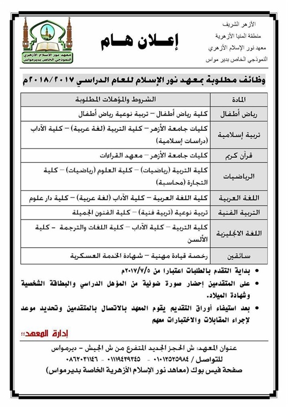 اعلن الازهر الشريف ،معهد نور الاسلام بمحافظة المنيا " مركز ديرمواس " عن حاجته لوظائف للعام الدراسى الجديد 2017 / 2018 وفقا للاعلان الرسمى والتخصصات المطلوبة فييه التى جاءت على النحو التالى :