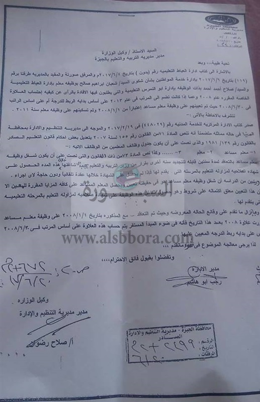 بالمستندات| "التعليم": وظيفة معلم مساعد تعتبر تعيين فعلى ويتم احتساب علاوة 2008 على اساسى الراتب وليس مربوط الدرجة