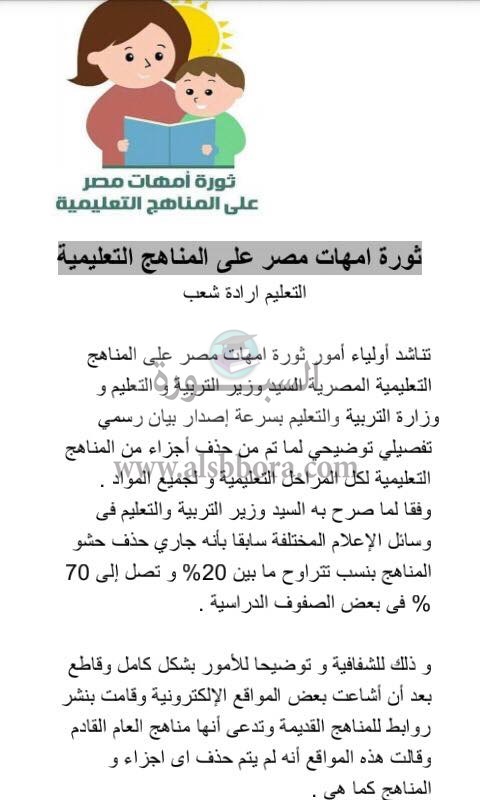 واضافت المصادر أن الحذف من المناهج يتضمن التدريبات بالكتاب المدرسى، والذى رفضه أولياء الأمور جملة وتفصيلا بعد استفتاء من صفحة ثورة أمهات مصر على المناهج التعليمية والذى جاء برفض 98% الغاء التدريبات.