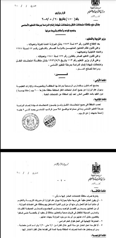 اولا :- نص القرار الوزاري رقم ١٥٠ الصادر بتاريخ ٢٠٠٥/٥/٣٠ بشأن منح مكافأة امتحانات النقل وامتحانات شهادة إتمام الدراسة بمرحلة التعليم الأساسي وتحديد قواعد وأحكام وشروط صرفها