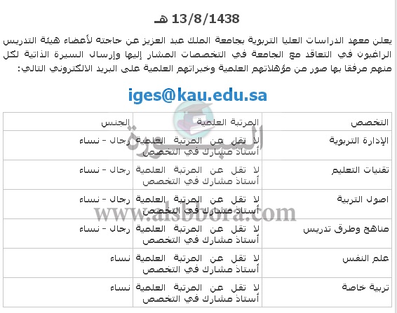تعلن جامعة الملك عبد العزيز بالسعودية عن وظائف جديدة لأعضاء هيئة التدريس "من حملة الماجستير والدكتوراه" وذلك وفقا لنص الإعلان التالي:-