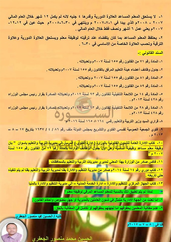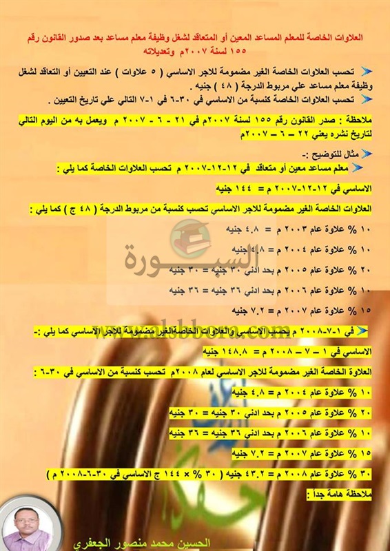 نشر الحسين محمد منصور الجعفرى على جروب "أعرف حقك" العلاوات الخاصة للمعلم المساعد المعين أو المتعاقد لشغل وظيفة معلم مساعد بعد صدور القانون رقم 155 لسنة 2007م وتعديلاته.
