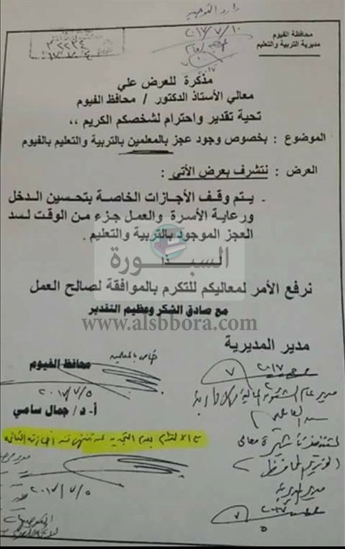 وافق الدكتور جمال سامى محافظ الفيوم بايقاف جميع اجازات المعلمين الخاصة بتحسين الدخول نظرا لحاجة مدارس المحافظة لهم وسد العجز فى الموسم الدراسى الجديد 2018/2017.