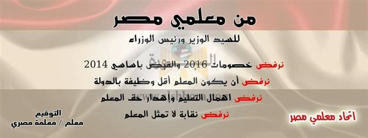 وتناول الرفض ايضا أن يكون المعلم أقل وظيفة بالدولة، بالاضافة الى رفض اهمال التعليم واهدار حق المعلم، كما جاء الرفض للنقابة التى لا تمثل المعلم.