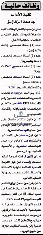 أعلنت جامعة الزقازيق عن وظائف جديدة لأعضاء هيئة التدريس بعدد من الكليات علما بأن أخر موعد للتقديم الأربعاء المقبل الموافق 19 يوليو وذلك وفقا لنص الإعلان التالي:-