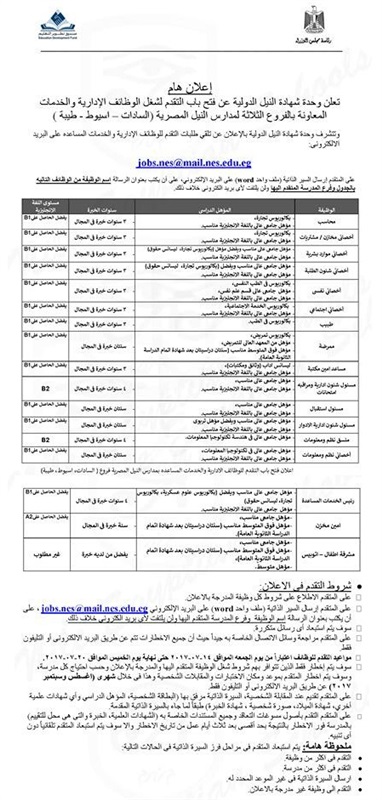 اعلنت وحدة شهادة النيل الدولية التابعة الى رئاسة مجلس الوزراء المصرية عن فتح باب التقدم لشغل الوظائف الادارية والخدمات المعاونة للعمل بفروع مدارس النيل الدولية وفقا للاعلان الرسمى المنشور بجريدة الاهرام حيث يتم التقديم على الوظائف حتى 20 / 7 / 2017