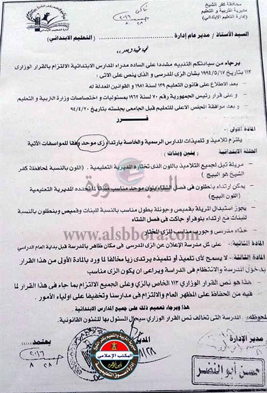 أصدرت وزارة التربية والتعليم قرارا وزاريا هاما الى جميع مديرى المدارس بالالتزام بالزى المدرسى والذى جاء كالتالى: