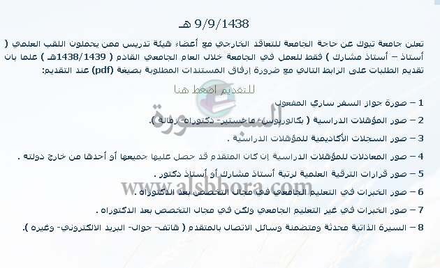 تعلن جامعة تبوك السعودية عن وظائف جديدة لأعضاء هيئة التدريس المصريين "من حملة الماجستير والدكتوراه" وذلك وفقا لنص الإعلان التالي: