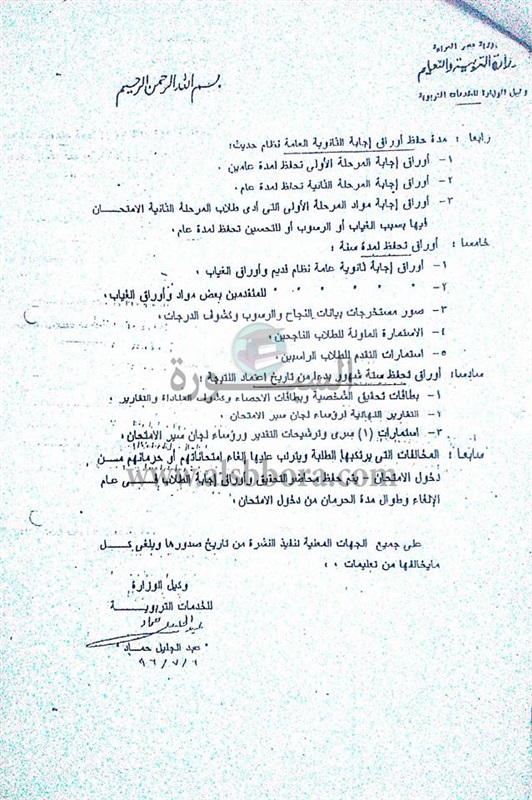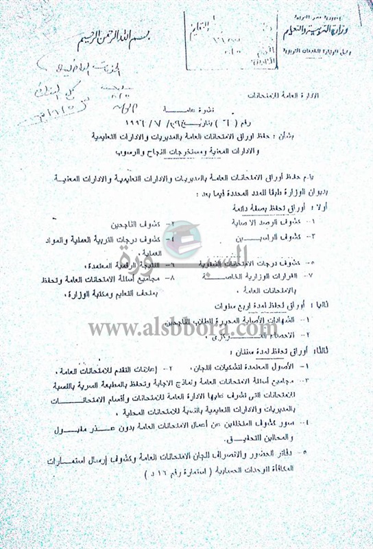 تداول نشطاء التعليم على جروب التوجيه المالى والادارى نشرة هامة وعامة والتى تحمل رقم ٦ بتاريخ صدور ١٩٩٦/٧/٢٩ والتى تعتبر من النشرات التى لاغنى عنها في المدارس حيث انها تختص بتحديد مدد حفظ أوراق الامتحانات العامة بالمديريات والإدارات التعليمية والإدارات المعنية ومستخرجات بيان النجاح والرسوب.