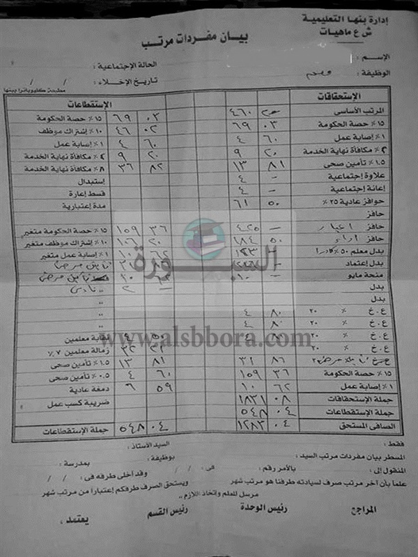 تداول نشطاء التعليم على موقع التواصل الاجتماعى "فيسبوك" منشور خاص لمفردات مرتب للمعلمين المعينين بقرار رقم 1407 عن الشهر الحالي ( يوليو 2017).