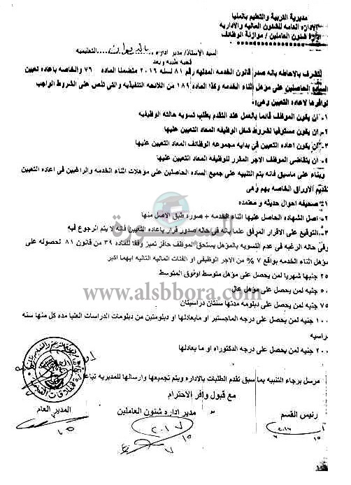 اصدرت مديرية التربية والتعليم بمحافظة المنيا قرارا وفقا لقانون الخدمة المدنية بالقانون 81 لسنة 2016 ، باعادة تعيين الحاصلين على مؤهل عالى اثناء الخدمة وفقا للمادة 189 من اللائحة التنفيذية والتى توضح الشروط المطلوبة، لاعادة التعيين والتى جاءت على النحو التالى:
