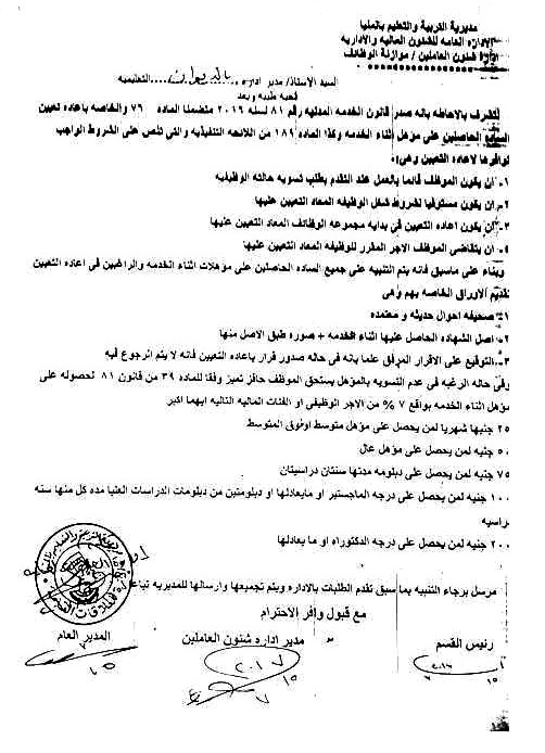 اصدرت مديرية التربية والتعليم بمحافظة المنيا قرارا وفقا لقانون الخدمة المدنية بالقانون 81 لسنة 2016 ، باعادة تعيين السادة الحاصلين على مؤهل عالى اثناء الخدمة وفقا للمادة 189 من اللائحة التنفيذية والتى توضح الشروط المطلوبة ، لاعادة التعيين والتى جاءت على النحو التالى :