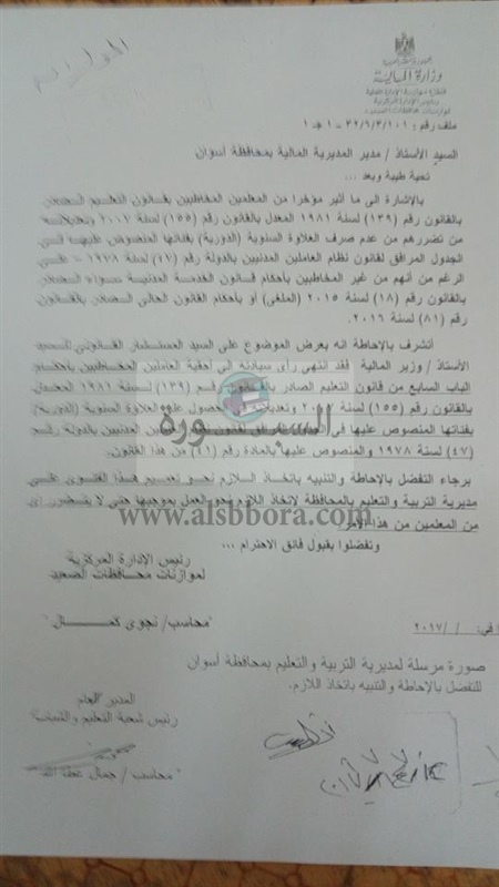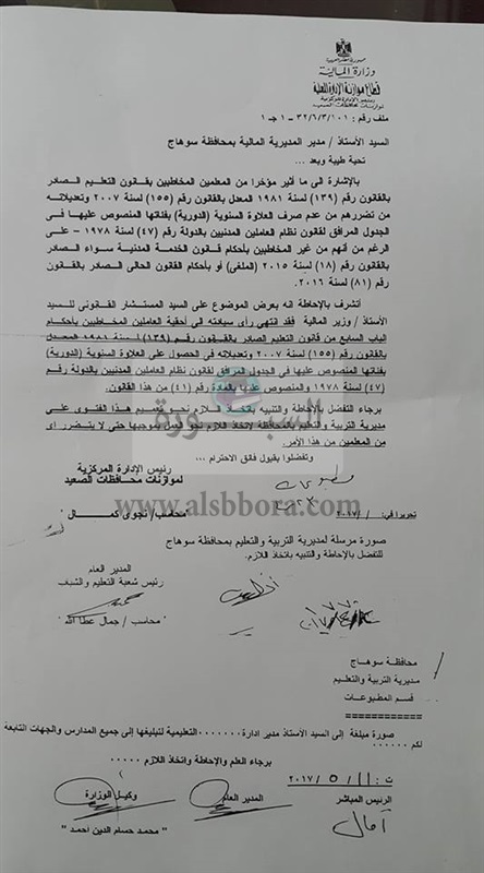 ينشر موقع السبورة القرارات الوزارية الصادرة من وزارة المالية بشأن أحقية المعلمين فى محافظات أسيوط وسوهاج وأسوان بصرف العلاوة الدورية طبقا لأحكام الباب السابع من قانون التعليم الصادر بالقانون رقم 139 لسنة 1988 وبالقانون رقم 155 لسنة 2007 وتعديلاته على العلاوة السنوية "الدورية" المنصوص عليها فى الجدول المرفق لقانون نظام العاملين المدنيين بالدولة رقم 47 لسنة 1978 والمنصوص عليها بالمادة رقم 41 من هذا القانون.