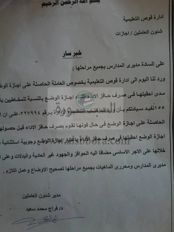 اخطرت وزارة التربية والتعليم قسم شئون العاملين بإدارة قوص التعليمية التابعه لمحافظة قنا ، بشأن أحقية الحاصلة علي اجازة وضع في الحصول علي حافز الأداء بناءًا علي كتاب مديرية التنظيم والادارة بقنا ، وقد صدرت النشرم لجميع المدارس بالادارة التعليمية لجميع المراحل باحقية العاملة الحاصلة على اجازة الوضع والتابعه للقانون 155 لسنة 2007 فى صرف حافز الاداء كاملا ، لاعتبار اجازة الوضع وجوبية ، وذللك وفقا لكتاب التنظيم والادارة 227994 والذى اقر بذلك ، وششد القرار على جميع محررى الماهيات تصحيح الاوضاع وعمل اللازم بجميع المدارس
