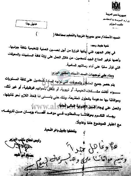 أوردت وزارة التربية والتعليم فاكسا الى جميع المديريات والادارات التعليمية بشأن حل جميع مشاكل المعلمين فى أسرع وقت بناء على توجيهات الدكتو طارق شوقى وزير التربية والتعليم والتعليم الفنى، ومنها حل مشكلة ترقيات حملة دبلوم المعلمين والمؤهلات المتوسطة وفوق المتوسطة.
