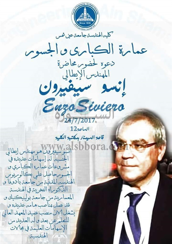 فى إطار أهتمام كليه الهندسه جامعه عين شمس بالتواصل الدائم مع الجامعات العالميه وتقديم كل ماهو جديد فى العلوم الهندسيه لإبنائها ، تعقد الكليه محاضره بعنوان "عماره الكبارى والجسور" يحاضر بها المهندس الإيطالى إنسو سيفيزون عميد المعهد العالى للتعليم عن بعد ،وذلك يوم الاثنين 24يوليو الساعه 12 ظهراً بقاعه السيمنار بمكتبه الكليه.
