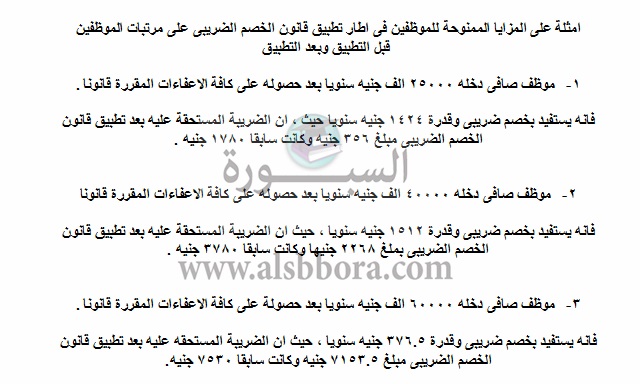 الموظف الذى يتقاضى راتب شهرى 2000 جنيه بدخل سنوى 24000 جنيه ، قبل تطبيق الكتاب الدورى كانت الضريبة الشهرية حتى 30 / 6 / 2017 = 146 جنيه ، ولكن بعد تطبيق القانون الجديد ستنخفض الضريبه لـ 28 جنيه شهرياً ، وبالتالى ستوفر الضريبة الجديدة 118 جنيه شهريا ، بمعدل 1414 جنيه سنويا كانت تخصم من الموظف وبعد القانون الجديد ستدخل ضمن مرتبه .