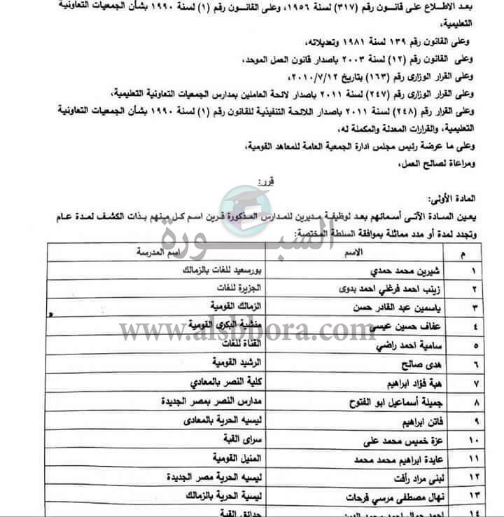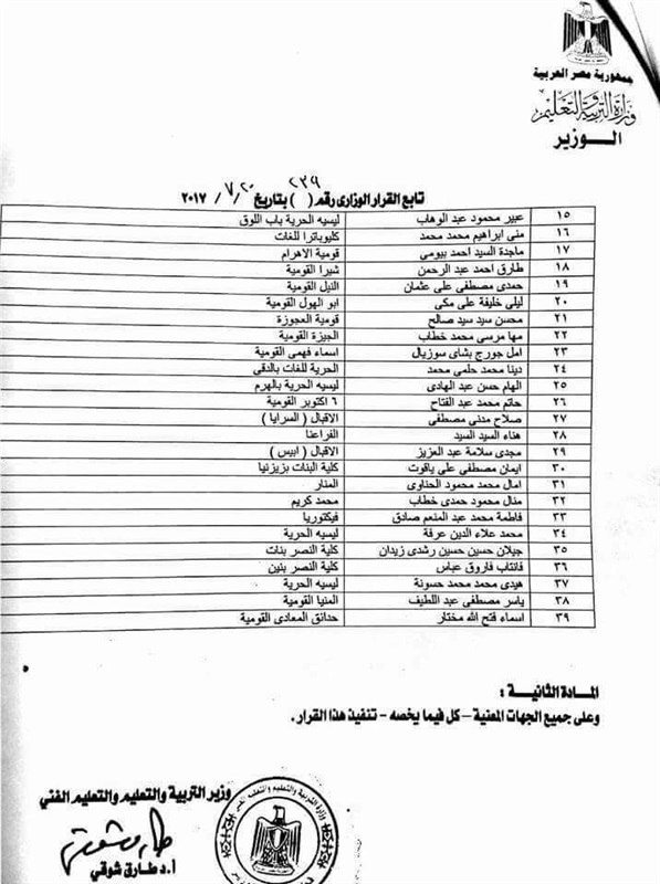 أصدر الدكتور طارق شوقى، وزير التربية والتعليم والتعليم الفنى، قرارا وزاريا بحركة تعيين مديرى عدد من المدارس القومية حيث نص القرار الوزارى على تعيين مديرى المدارس لمدة عام.