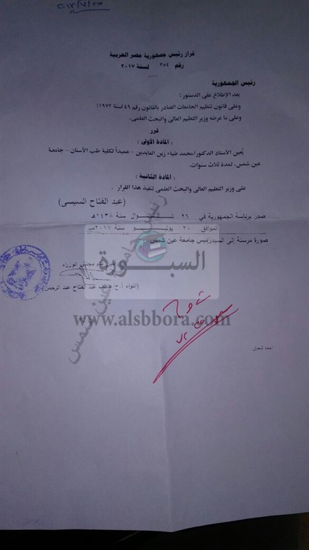 أصدر رئيس الجمهورية السيد عبد الفتاح السيسى قرار بتعيين الدكتور محمد ضياء زين العابدين عميداً لكلية طب الأسنان جامعة عين شمس وذلك من تاريخ 20 يوليو 2017 ولمدة ثلاث سنوات.