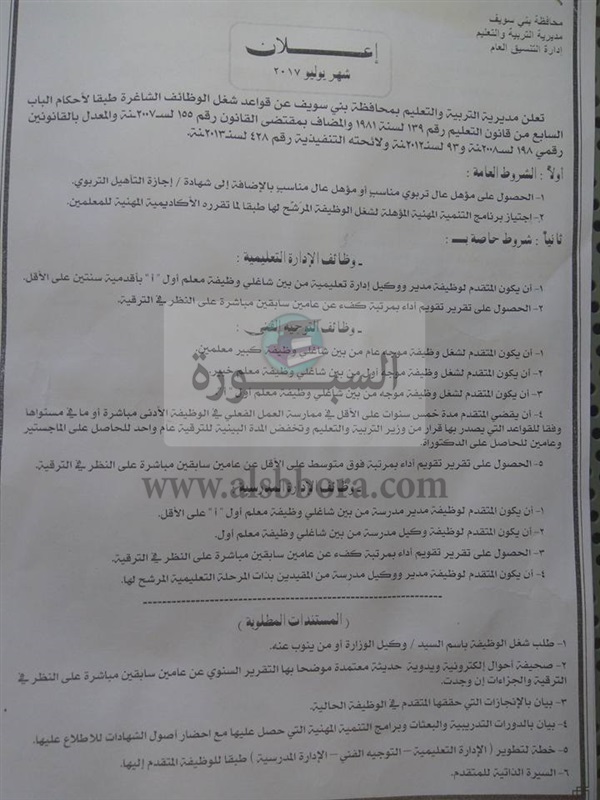 أعلنت مديرية التربية والتعليم بمحافظة بنى سويف عن القواعد العامة والشروط المطلوبة للوظائف التعليمية المراد شغلها داخل المديرية، والتى جاءت كالتالى: