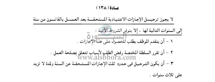 ينشر موقع السبورة المادة رقم 138 من اللائحة التنفيذية للقانون رقم 81 لسنة 2016 م الصادرة بقرار رئيس مجلس الوزراء رقم 1216 لسنة 2017م عدم ترحيل الاجازة الاعتيادية إلا بالشروط التالية: