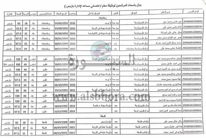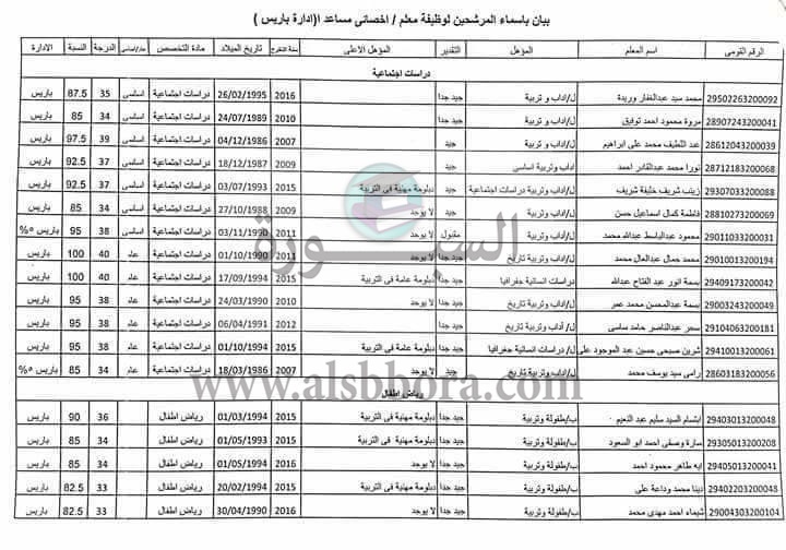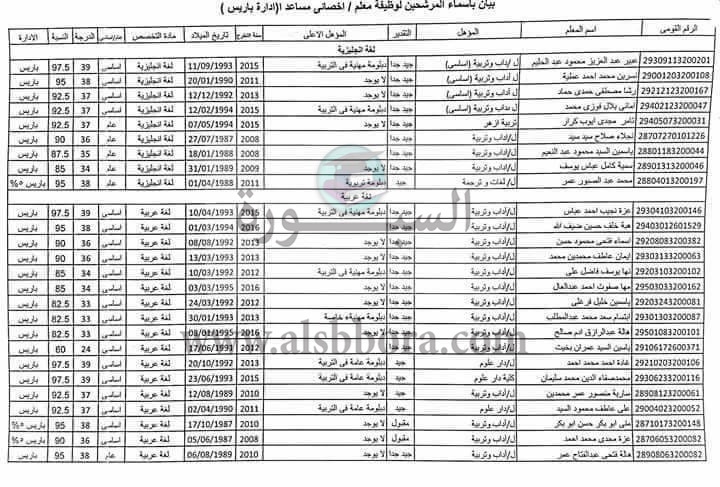 أعلنت مديرية التربية والتعليم أسماء المقبولين ضمن مسابقة 300 معلم مساعد لادارة باريس ، و أشار اللواء محمد الزملوط إلي أن الأسماء التي سيتم الاعلان عنها لن تكون نهائية حتي يتم التأكد من استيفائها كل الشروط وتلقي كافة التظلمات .