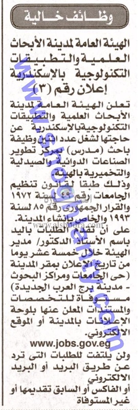 تعلن مدينة الأبحاث العلمية بالإسكندرية عن وظائف جديدة للباحثين "من حملة الماجستير والدكتوراه".. ننشر نص الإعلان