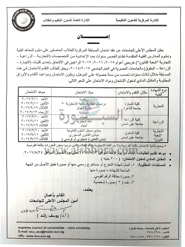 يعلن المجلس الاعلى للجامعات عن عقد امتحان المسابقة المركزية للطلاب الحاصلين على دبلوم المعاهد الفنية ودبلوم المدارس الفنية المتقدمة نظام الخمس سنوات بعد الاعدادية من التخصصات" التجارة، الزراعة، الحقوق" بالجامعات المصرية فى العام الجامعى 2017\2018، ويحق للطالب التقدم خلال ثلاث سنوات من سنة حصولة على المؤهل، ويكون مواعيد التقدم الاوراق المطلوبة والمقابل المادى لدخول الامتحان على النحو التالى