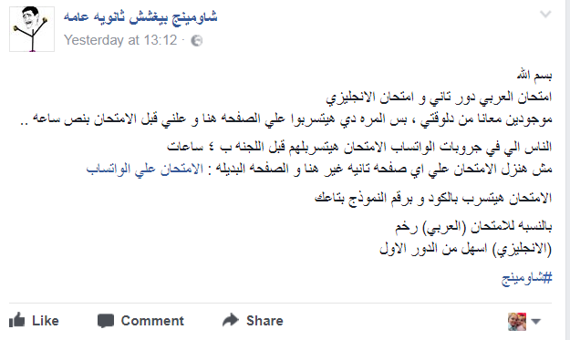 وكتبت الصفحة فى بيان لها: "امتحان العربى دور تانى وامتحان الإنجليزى.. موجودين معانا من دلوقتى، بس المرة دى هيتسربوا على الصفحة هنا وعلنى قبل الامتحان بنص ساعة".