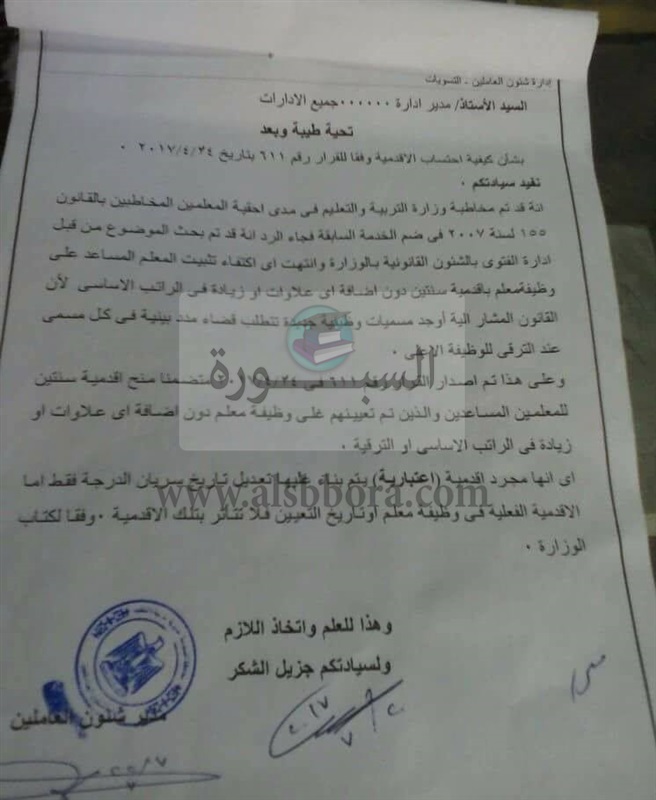 أصدرت ادارة الفتوى بالشئون القانونية بوزارة التربية والتعليم أحقية المعلمين المساعدين فى منح اقدمية سنتين والذين تم تعيينهم على وظيفة معلم دون اضافة اى علاوات أو زيادة فى الراتب الاساسى او الترقية.