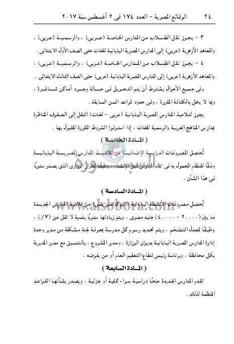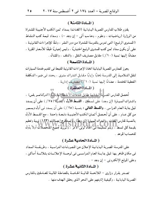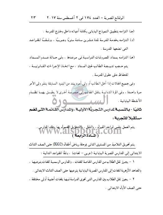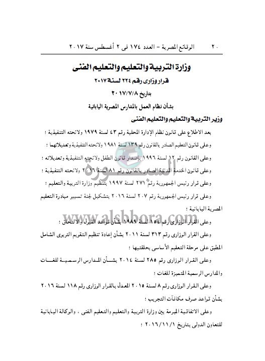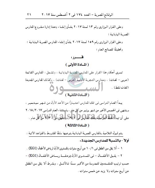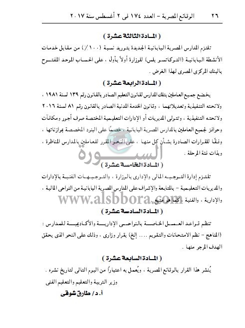 نشرت جريدة الوقائع المصرية "ملحق الجريدة الرسمية" فى عددها الصادر اليوم الأربعاء، قرار الدكتور طارق شوقى وزير التربية والتعليم والتعليم الفنى والخاص بآليات العام الدراسى بالمدارس المصرية اليابانية القائمة "عربى – لغات "، والمدارس التجربة الأولية "عربى – لغات"، والمدارس الجديدة لغات فقط.