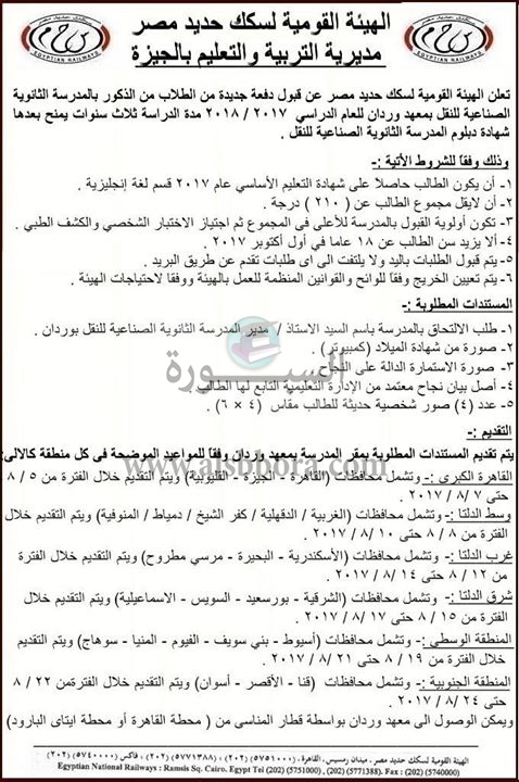 أعلنت الهيئة القومية لسكك حديد مصر عن قبول دفعة جديدة من الطلاب الذكور بالمدرسة الثانوية الصناعية للنقل بمعهد وردان للعام الدراسى 2018/2017 مدة الدراسة ثلاث سنوات يمنح بعدها شهادة دبلوم المدرسة الثانوية الصناعية للنقل، وجاءت الشروط والأوراق المطلوبة وفقا للاعلان التالتى:
