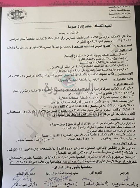 في اطار برنامج المشروع القومي لاعداد قاده المستقبل الذي تقيمه وزارة الاتصالات بالتعاون مع وزارة التربية و التعليم وهو مشروع يهدف الي صقل شخصية الطالب بمهارات تجعل منه مشروع قائد فعال ..تستقبل قي المركز الرئيسي للانشطة التربوية بالعجوزة المستهدف من طلاب الصف الثالث الاعدادي و الاول و الثاني الثانوي شريطة نسبة نجاحه 85% واجتياز الاختبار التحريري الذي سيقام لاحقا في المركز الاستكشافي بالخارجة