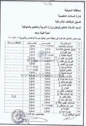 اعلن الشحات السبكي مديرعام ادارة السادات التعليمية عن الاماكن الشاغره بالادارة في منصب وكيل ومدير مدرسة تمهيدا للانتهاء من ملء تلك الاماكن عن طريق المقابلات الشخصية للجنة قيادات التعليم