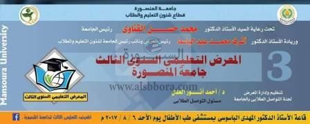 تنظم لجنة التواصل الطلابي بجامعة المنصورة المعرض التعليمى السنوى الثالث يوم الاحد الموافق 6 أغسطس 2017 في قاعة المهدى الباسوسى بمستشفى الاطفال