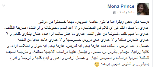 وأكدت منى برنس، عمرى ما هدخل أقول أى كلام فى المحاضرة أو أشتغل بطريقة الكُتّاب، ولن أبتز الطلاب عشان يشترى كتابى ولا عمرى هتحرش بطلبة ولا عمرى هدى دروس خصوصية ولا عمرى هاخد هدايا من الطلبة، هفضل منى برنس أستاذة بجد عارفة يعنى إيه تدريس، عارفة يعنى إيه حوار واختلاف آراء، وكاتبة روائية، مؤلفاتى بيدرس برة مصر، وبيتعمل عليها دراسات أكاديمية مختلفة، ومترجمة أضيف للمكتبة العربية دراسات ونصوص أدبية، وهفضل أرقص وأغنى وأبدع كتابة وترجمة وأفرح بحياتى.