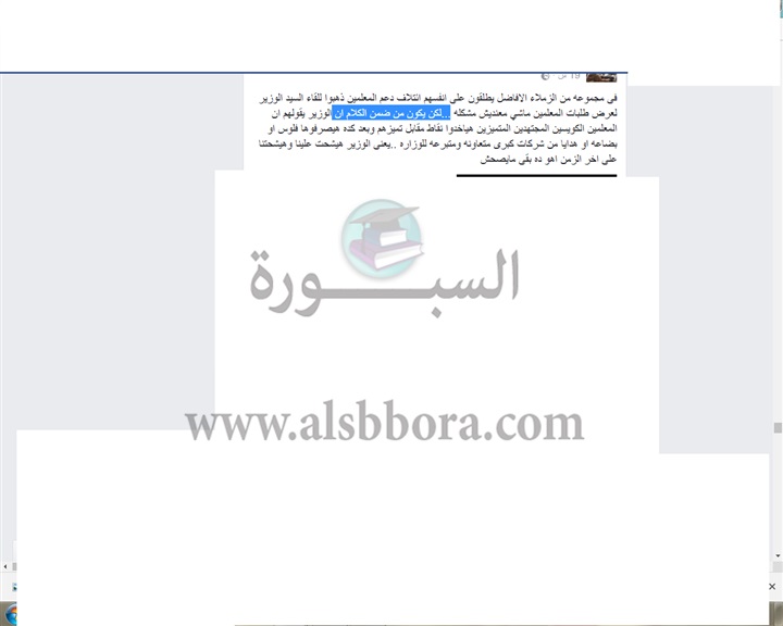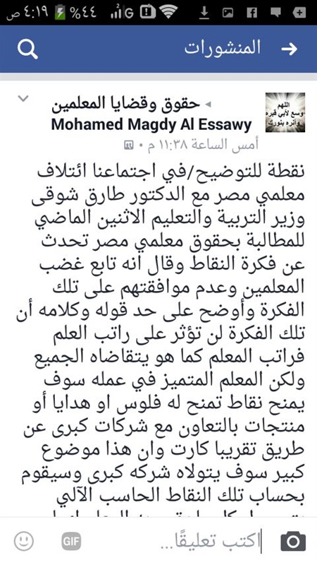 تداول نشطاء المعلمين علي مواقع التواصل الاجتماعي"فيس بوك"،ان مجموعه من الزملاء الافاضل يطلقون على انفسهم ائتلاف دعم المعلمين ذهبوا للقاءالوزير ...لكن يكون من ضمن الكلام ان الوزير يقولهم ان المعلمين الكويسين المجتهدين المتميزين هياخدوا نقاط مقابل تميزهم وبعد كده هيصرفوها فلوس او بضاعه او هدايا من شركات كبرى متعاونه ومتبرعه للوزاره .